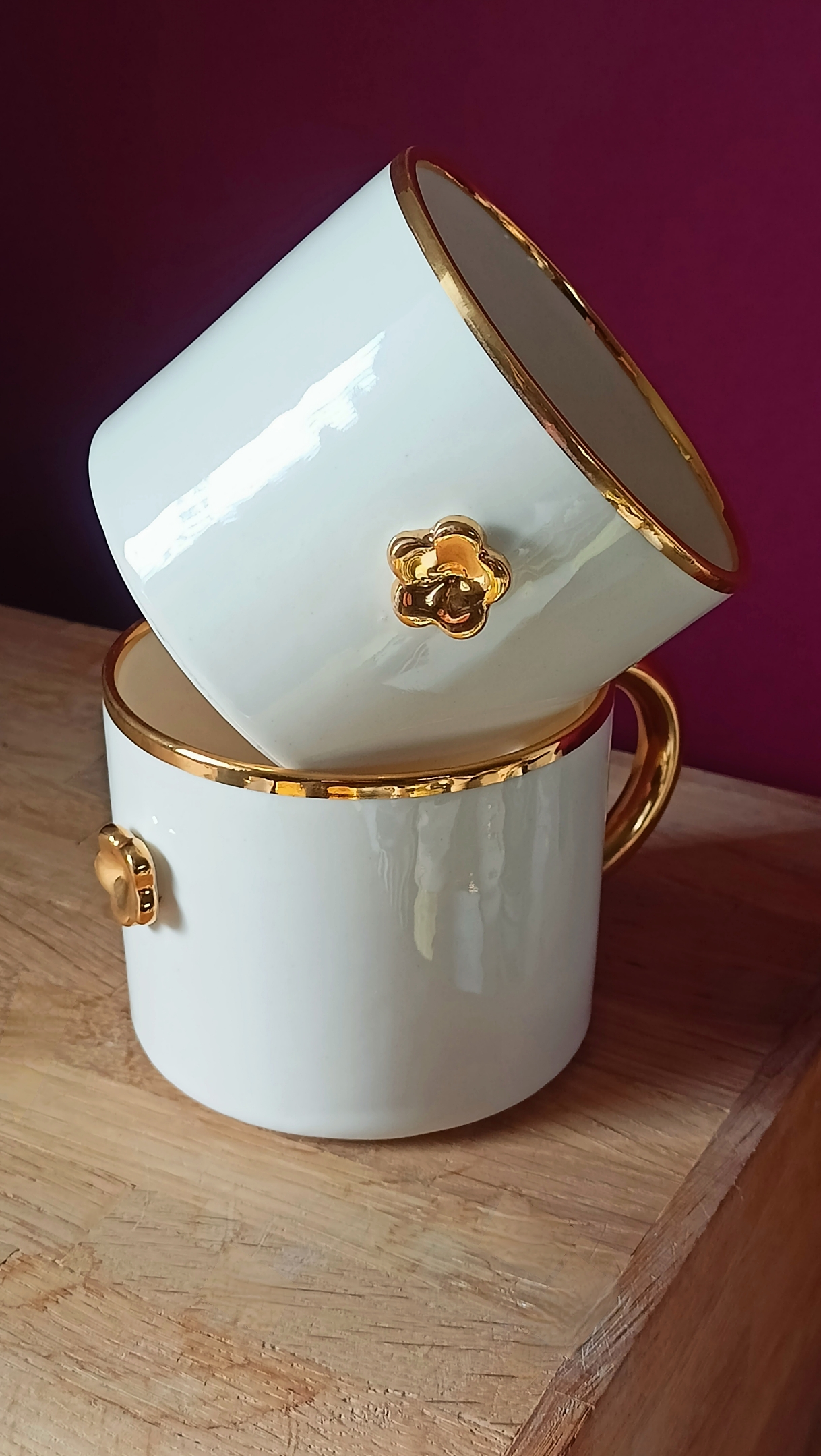 Projekt: Karolina Szeląg Kubek z serii DAISY z charakterystycznym małym złotym kwiatkiem i uchem w kształcie podkowy, to uniwersalny prezent na każdą okazję. Subtelnie wyraża gest miłości, podziękowań, serdeczności, przywiązania. Stworzony została z myślą o wszystkich , którzy cenią sobie klasyczną formę i nienachalną elegancję. Występuję w kilku kolorach i świetnie komponuje się z seria IN LOVE . Wszystkie kolory doskonale się uzupełniają. Materiały: Najlepszej jakości polska masa porcelanowa produkowana lokalnie w Chodzieży i wypalana w temperaturze 1250C. Ze względu na ręczny charakter pracy oraz użycie naturalnych pigmentów, szkliw kolor porcelany oraz szkliw może różnić się w zależności od partii. Szkliwa posiadają atest przydatności do kontaktu z żywnością i są produkowane w Polsce. Filiżanki ze złoceniami malowane są prawdziwym złotem wypalanym w temperaturze 830C; jest ono również bezpieczne w kontakcie z żywnością. W przypadku produktów złoconych polecam mycie ręczne. Produkty bez złoceń można myć w zmywarce. Proces: Naczynia są odlewane w formach gipsowych z płynnej porcelany, następnie ręcznie retuszowane, malowane dekoracją podszkliwną i wypalane wstępnie w temperaturze 860C,na tak zwany biskwit. W kolejnym etapie ręcznie szkliwione, po czym ponownie wypalane na ostro w temperaturze 1250C. W końcowym etapie ,( trzecim) ceramika jest malowana złotem i ponownie wypalana w temperaturze 830C. Czas realizacji produktu na zamówienie wynosi ok.2-4 tygodni roboczych. Każde zamówienie rozpatruje jednak indywidualnie; z przyczyn niezależnych ode mnie podany czas może ulec wydłużeniu. Wymiary: wysokość: 7,5cm średnica kubka: 9 cm Pojemność: 300ml W przypadku braku dostępności danego produktu, proszę o kontakt mailowy.