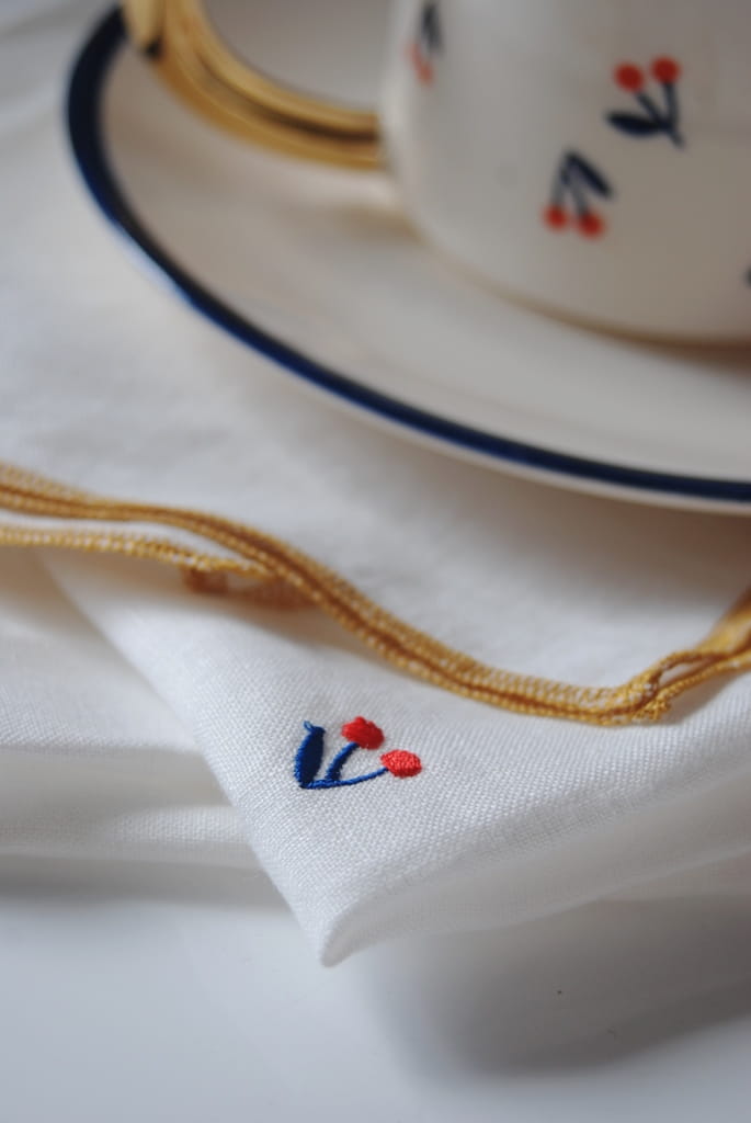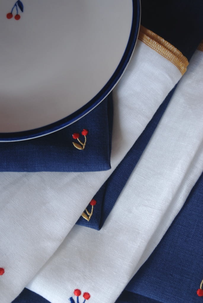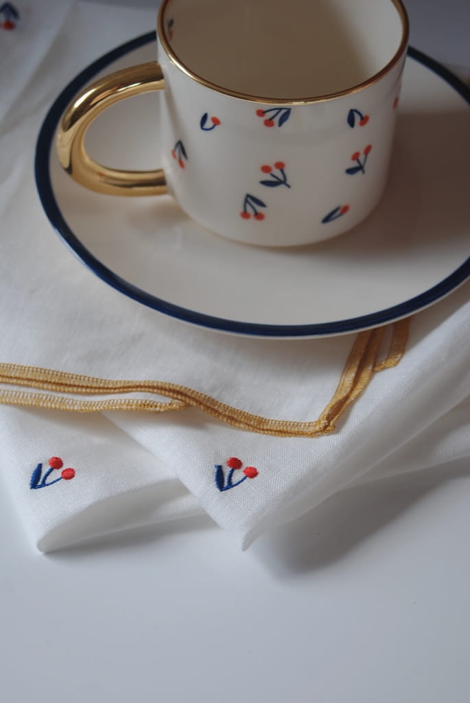 Wykonane są z lnianego naturalnego materiału w kolorze bieli z wyhaftowaną na środku każdej serwetki małą wisienką i wykończone lamówką w kolorze złota, które nawiązuje do złotych elementów kubków, filiżanek, tacy z serii BLUE BIRD.