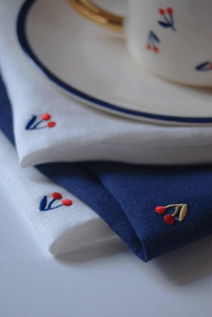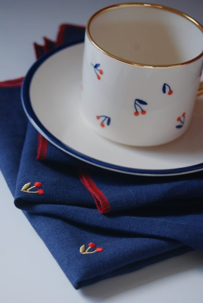 Wykonane są z lnianego naturalnego materiału w kolorze kobaltu z wyhaftowaną na środku każdej serwetki małą wisienką i wykończone lamówką w kolorze czerwonym, który nawiązuje do czerwonych owoców wisienek malowanych na kubkach, filiżankach czy puzderkach z serii BLUE BIRD.